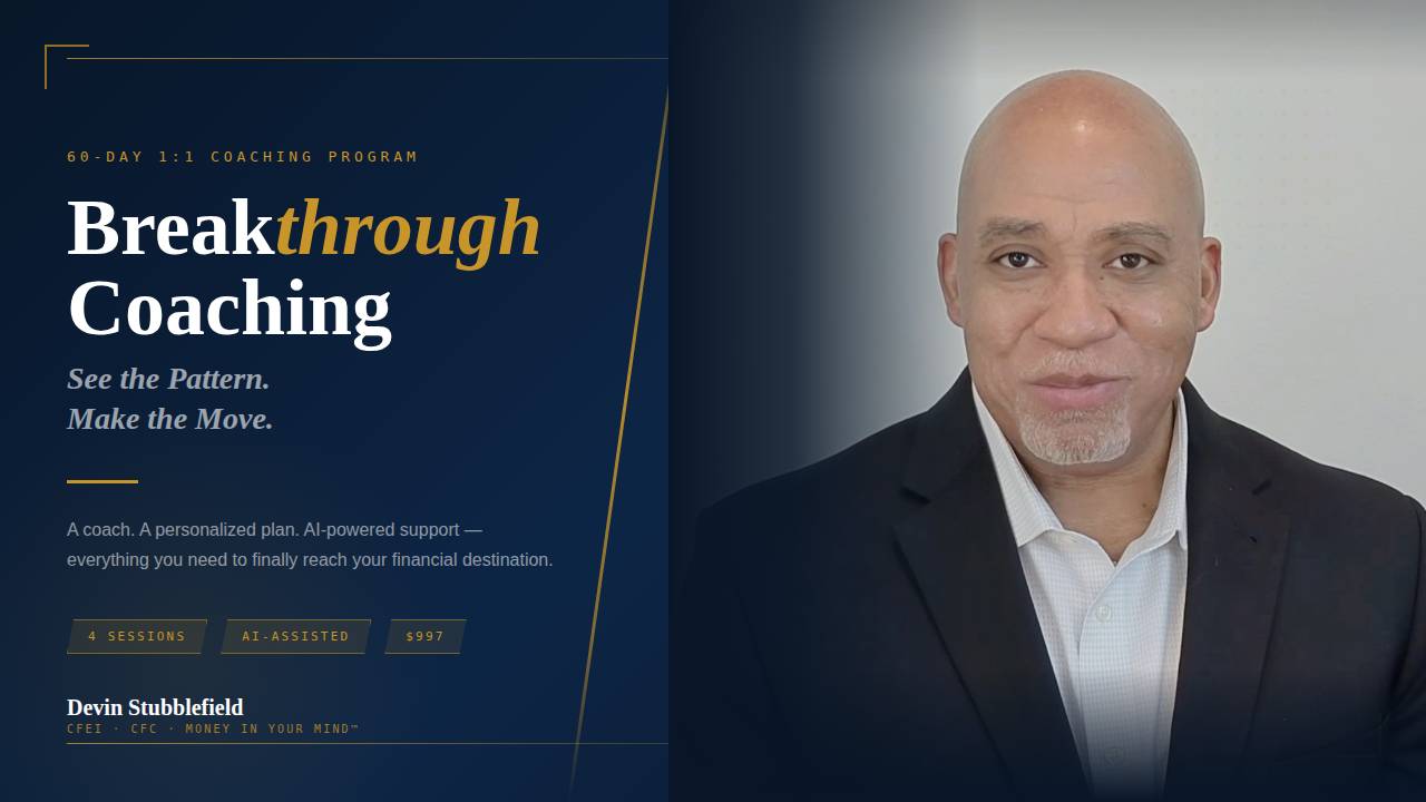 One-on-one with Coach Devin Stubblefield, CFEI Β· CFC. Each session is built around your specific situation, your Money Mind, and your financial destination.
